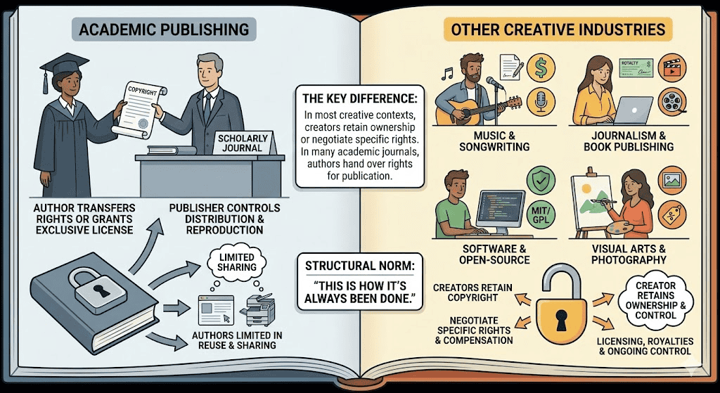 The key difference is that in most creative contexts, creators retain ownership or negotiate specific rights and compensation. By contrast, many academic journals require authors to hand over the rights that allow publishers to control and monetize reuse and distribution in exchange for publication and prestige.