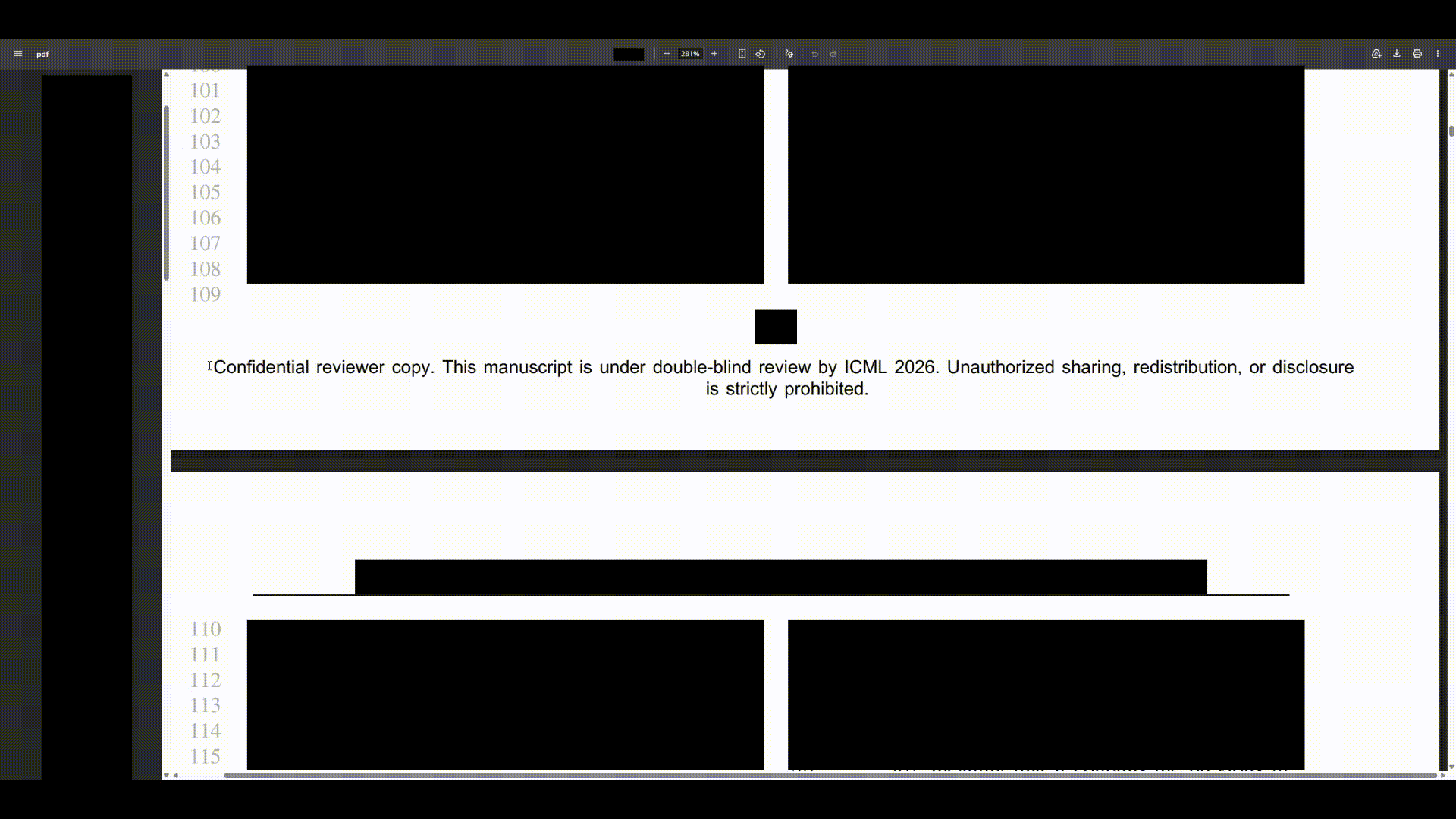As in the screenshot I recorded (below), the instruction is not visible in the rendered document and is hidden behind the automatically generated watermark that says “Confidential reviewer copy. This manuscript is under double-blind review by ICML 2026. Unauthorized sharing, redistribution, or disclosure is strictly prohibited.”